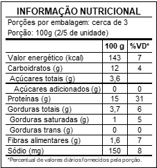 Filé de peito, batata doce, alho poró, alho, cebola, limão, vinagre, azeite, ervas finas, manjericão, pimenta do reino, alecrim, cúrcuma, páprica picante e sal. NÃO CONTÉM GLÚTEN.