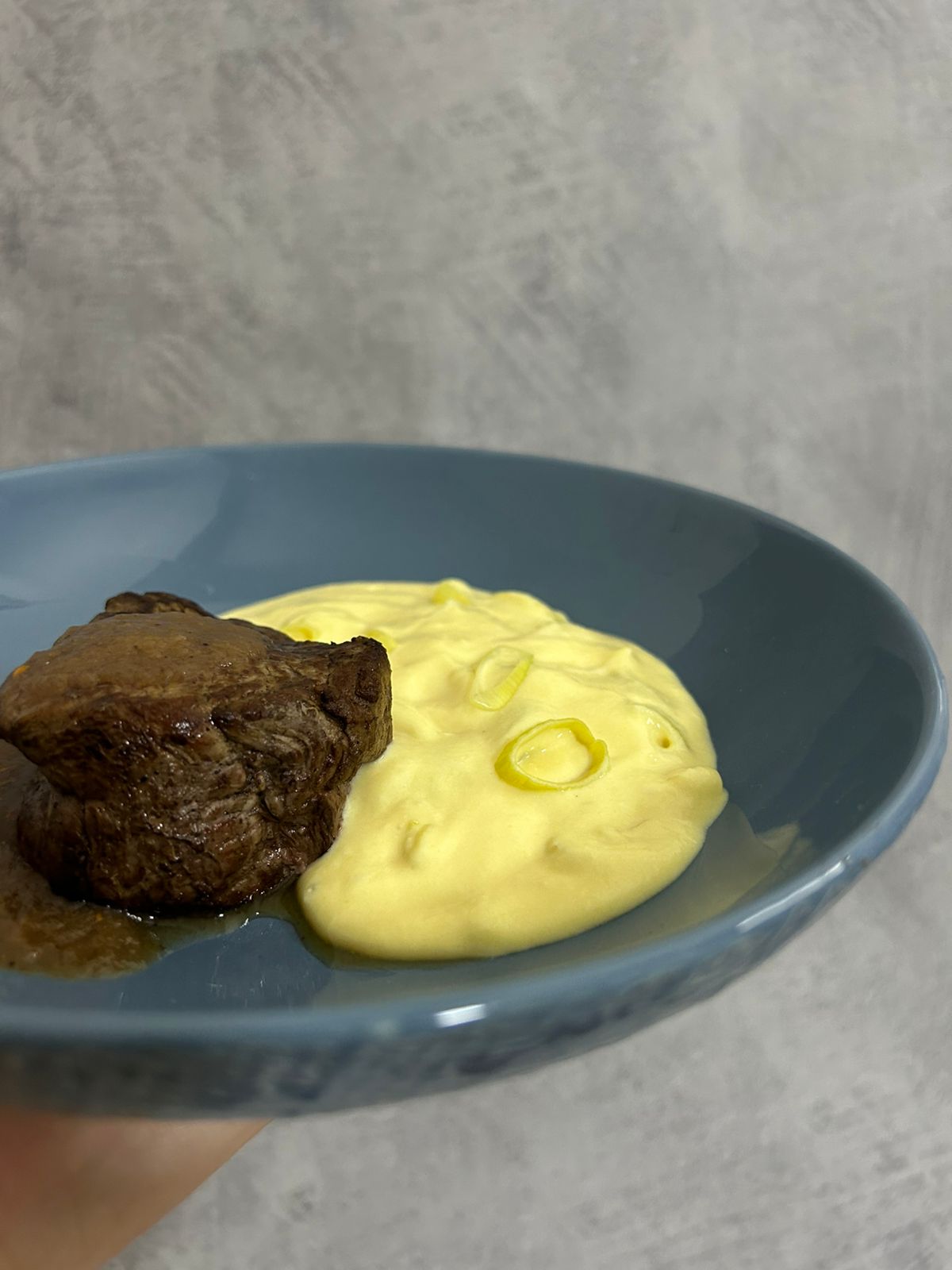 Filé mignon, batata baroa, creme de leite light, demi glacê, alho poró, manteiga, tomilho, pimenta do reino, alho, cebola e sal. NÃO CONTÉM GLÚTEN. CONTÉM LACTOSE.
