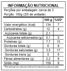 Queijo ricota, leite desnatado, espinafre, farinha de trigo enriquecida com ferro e ácido fólico, polpa de tomate, ovo, queijo parmesão, óleo de girassol, pimenta do reino, sal, orégano, manjericão e xilitol. CONTÉM LACTOSE. CONTÉM GLÚTEN.