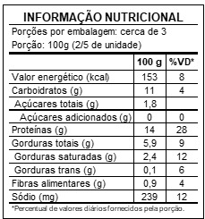 Ingredientes: peito de frango, leite desnatado, requeijão light, farinha de trigo enriquecida com ferro e ácido fólico, polpa de tomate, cebola, alho, queijo parmesão, creme de leite light, cheiro verde, óleo de girassol, xilitol, sal, tomilho, pimenta do reino e salsa. CONTÉM GLÚTEN. CONTÉM LACTOSE.