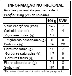 Ingredientes: carne bovina, leite desnatado, tomate, farinha de trigo, ovo, polpa de tomate, espinafre, cebola, queijo parmesão, alho, azeite, ervas finas, páprica picante, xilitol, óleo de girassol, manjericão, pimenta do reino e sal. CONTÉM LACTOSE. CONTÉM GLÚTEN.