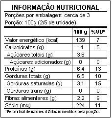 batata doce, ovo, creme de leite, farinha de aveia, cenoura, queijo parmesão, farinha de arroz, alho poró, azeite, sal, pimenta do reino e manjericão. CONTÉM LACTOSE. CONTÉM GLÚTEN.
